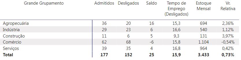 De janeiro a agosto de 2025, o saldo em Reserva foi positivo, com a criação de 51 novos postos de trabalho, fruto de 1.374 contratações e 1.323 demissões.