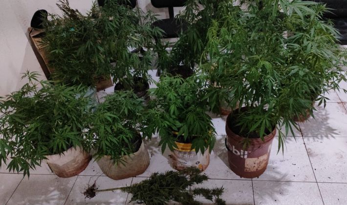No decorrer dos procedimentos, o abordado também informou de maneira espontânea que, em sua residência, possuía plantas de maconha cultivadas de forma artesanal. Com autorização formal para busca domiciliar, as equipes deslocaram até o endereço indicado, onde localizaram 10 plantas adultas de Cannabis sativa, 12 mudas pequenas, 61 mudas em desenvolvimento acondicionadas em colmeias de plantio, e uma planta em processo de secagem. Todo o material foi fotografado, identificado, coletado e apreendido conforme as normas legais e de preservação da cadeia de custódia.