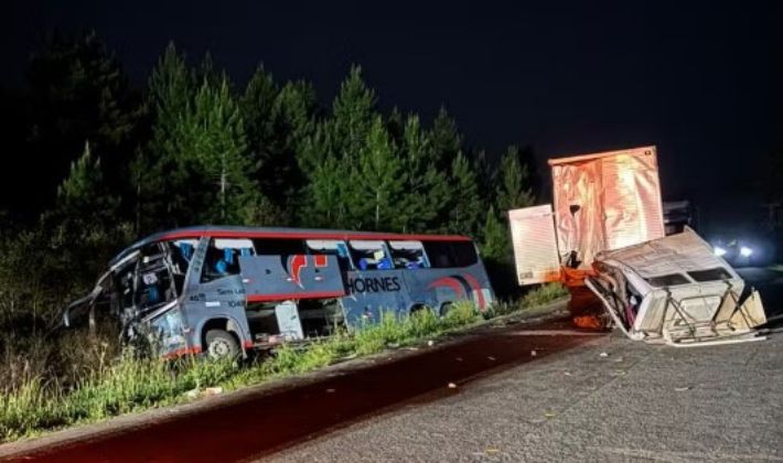 Duas pessoas morreram e outras 23 ficaram feridas em um grave acidente envolvendo um ônibus e um caminhão na noite de domingo (5), na PR-151, entre São Mateus do Sul (PR) e Três Barras (SC). A colisão aconteceu por volta das 21h20, no km 468 da rodovia, na localidade de São Miguel da Roseira.