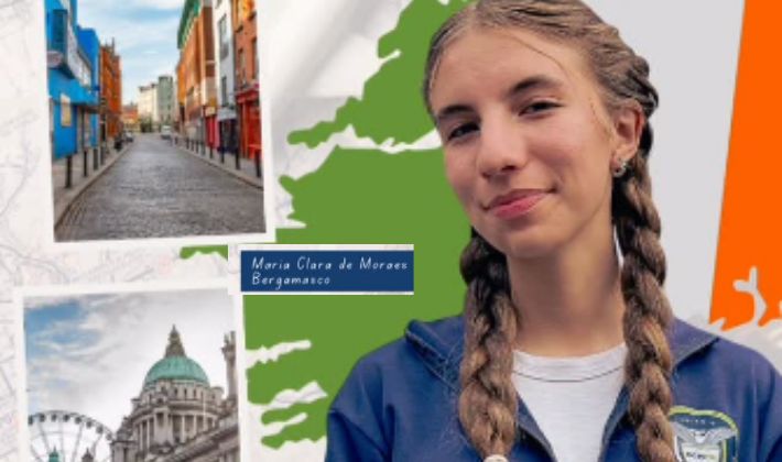 Maria Clara foi aprovada para representar o colégio na Irlanda, na Europa, onde participará de atividades acadêmicas e culturais durante o período de intercâmbio.