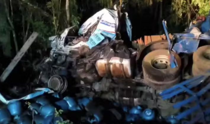 Com o impacto, a carga de erva-mate se espalhou pela pista, e os botijões de gás caíram tanto na rodovia quanto no barranco. Houve também vazamento de combustível, o que exigiu a intervenção dos bombeiros para conter o risco de explosão e incêndio.