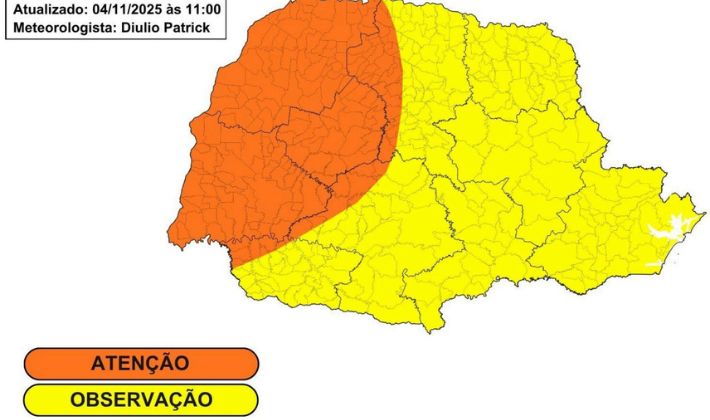 De acordo com o Simepar, o Noroeste e o Oeste do Estado já amanhecem com tempestades na quarta-feira, que devem avançar para outras regiões ao longo do dia, mas tendem a perder força gradualmente. Nessas áreas, há risco de chuva intensa em curto período, rajadas de vento fortes, descargas elétricas e granizo pontual. Na quinta-feira (6), o tempo deve ficar mais estável, com chuvas ocasionais apenas em pontos isolados.