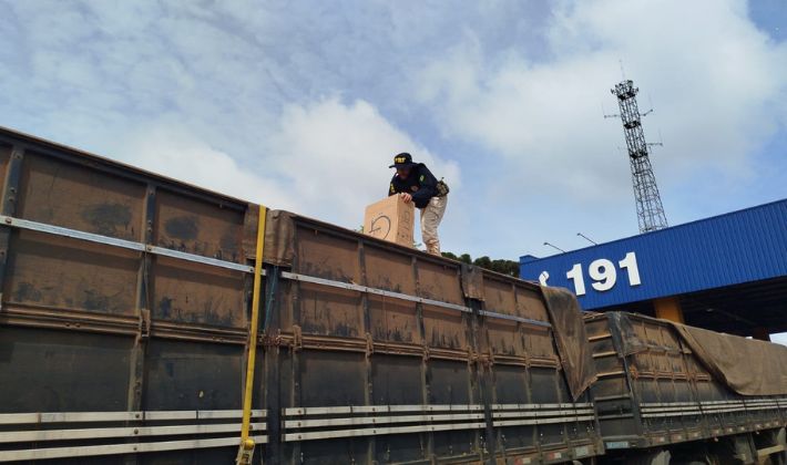 Uma carreta bitrem carregada com milho foi interceptada na manhã desta sexta-feira (por volta das 9h30) no posto da Polícia Rodoviária Federal (PRF) em Cascavel, no Oeste do Paraná. Durante a fiscalização, agentes encontraram aproximadamente 400 caixas de cigarros de origem ilícita escondidas sob a carga de grãos. A quantidade exata será confirmada pela Receita Federal, responsável pela conferência oficial.