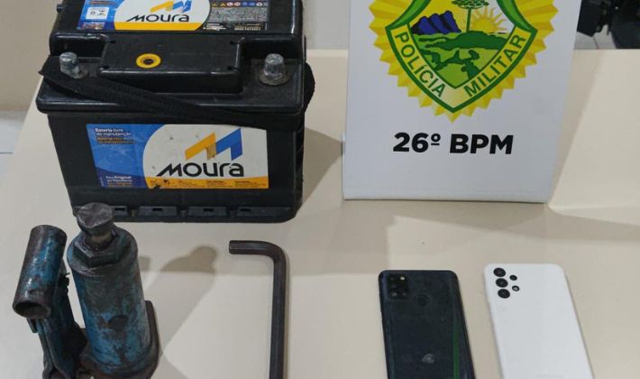 Na residência indicada, um homem relatou que os itens haviam sido deixados ali por outro indivíduo durante a madrugada. Ele também informou o paradeiro de uma bateria automotiva, também subtraída no crime. Na casa ao lado, a convivente de um dos suspeitos confirmou a participação no furto e apontou a bateria, que pôde ser vista logo na entrada do imóvel.