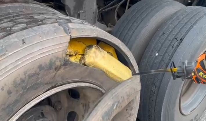 Diante da suspeita, cães farejadores foram acionados e indicaram a presença de ilícitos nas rodas e na caixa de ferramentas da carreta. Em vistoria minuciosa, os policiais encontraram inicialmente uma bolsa com haxixe. Com o apoio do Corpo de Bombeiros, diversos pneus do cavalo-trator e do semirreboque foram desmontados, revelando grande quantidade de maconha ocultada em seu interior.