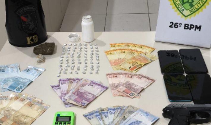 No interior do imóvel foram apreendidas porções significativas de substância análoga ao crack e à maconha, além de dinheiro em notas fracionadas, aparelhos celulares, uma máquina de cartão e uma pistola de pressão à gás, evidenciando a estrutura utilizada para a venda de drogas no local.
