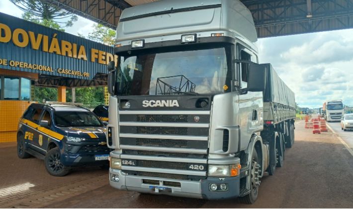 O veículo de carga chamou a atenção da equipe policial ao passar em frente à unidade apresentando alterações visíveis no para-choque do semirreboque, além da ausência da placa de identificação traseira do caminhão-trator. Diante da situação, os policiais realizaram a abordagem para verificação.