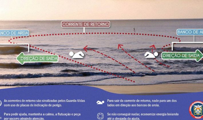 O Corpo de Bombeiros Militar do Paraná (CBMPR) reforça aos turistas de férias no Litoral que é preciso estar atento às correntes de retorno no mar, um fenômeno responsável por muitos incidentes de afogamento. Este tipo de corrente é formada pelo retorno da água que chega à faixa de areia com as ondas.