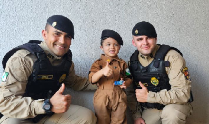 O pequeno Raul, de apenas 3 anos de idade e grande admirador da corporação, foi surpreendido com um presente especial: uma fardinha da Polícia Militar.