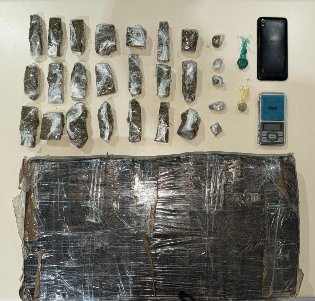 No interior do imóvel, um indivíduo tentou se evadir ao perceber a presença policial, mas foi abordado. Próximo a ele, havia grande quantidade de substância análoga à maconha, visivelmente exposta, totalizando quase 10 quilos do entorpecente, parte em tabletes e parte já fracionada e pronta para comercialização. Também foram apreendidos um aparelho celular e uma balança de precisão.