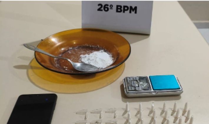 Resultados da ocorrência: 1 preso, 14,8 g de cocaína, 3,6 g de crack e 1 aparelho celular.