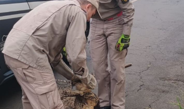 Ao chegar ao local, os agentes constataram que a coruja estava caída em via pública, sem conseguir voar, apresentando sinais de ferimento e possível fratura em uma das asas. Diante do quadro, a Guarda Municipal entrou em contato com o Corpo de Bombeiros para apoio especializado no atendimento da ocorrência.