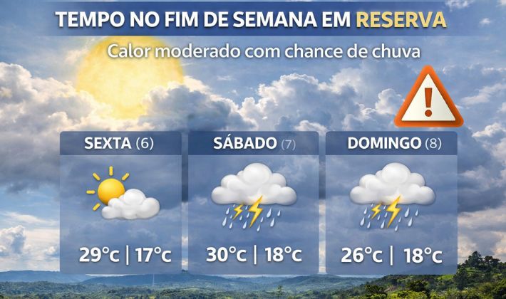 O fim de semana em Reserva será marcado por temperaturas elevadas e possibilidade de chuva, especialmente entre sábado (7) e domingo (8). A previsão é do Sistema de Tecnologia e Monitoramento Ambiental do Paraná (Simepar).