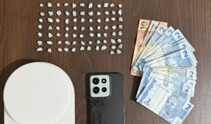 Resultados da ocorrência: 01 indivíduo preso; 81 pedras de substância análoga ao crack; 01 papelote de substância análoga à cocaína; 01 aparelho celular; 01 balança de precisão e R$ 51,00 em dinheiro apreendido.