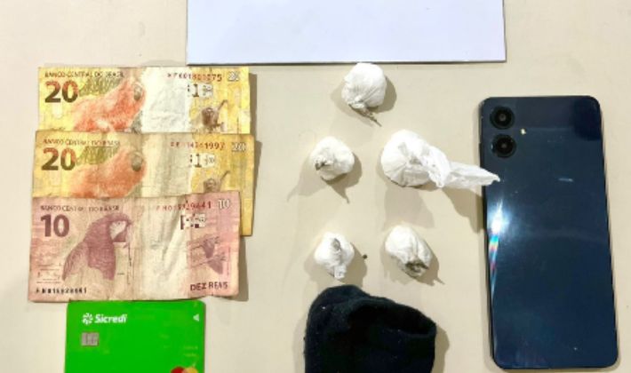 Diante da fundada suspeita e após sinalização de funcionário do estabelecimento, foi realizada abordagem. Na busca pessoal, foram localizadas cinco porções de substância análoga à cocaína, totalizando 20,4g, além de dinheiro em espécie e aparelho celular.