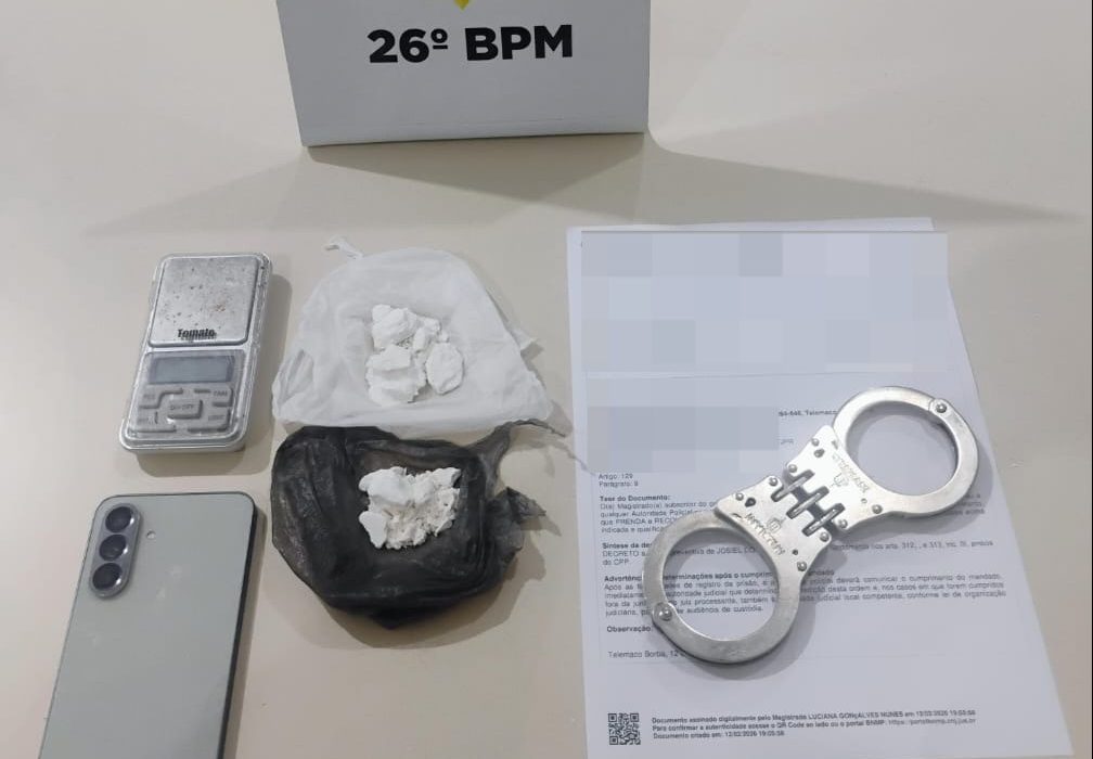De posse das informações, os policiais realizaram diligências no endereço indicado no mandado. Durante as buscas, localizaram o veículo utilizado pelo foragido estacionado em frente a um residencial. Após autorização de um morador para acesso à área comum, a equipe visualizou, no interior de um dos apartamentos, dois indivíduos manipulando substância análoga à cocaína sobre uma mesa, onde também havia porção adicional da droga e uma balança de precisão.