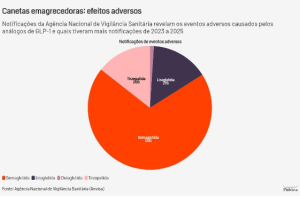 Entre os eventos adversos, complicações laterais que podem surgir durante o tratamento, a maioria já prevista em bula, a maior parte dos registros se resume a náuseas, vômitos, mal-estar e diarreia. Os registros mais graves representam 1% do total de 2.436 notificações entre 2023 e 2025 e incluem a pancreatite, a astenia (falta de força e disposição que não passa mesmo após dormir) e a experiência de morte iminente, com 71 ocorrências. A agência esclarece que “uma única notificação pode conter mais de um evento adverso, podendo, portanto, registrar mais de um desfecho”.