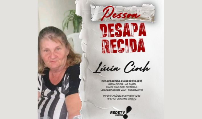 A RedeTV! Paraná divulgou um pedido de ajuda para localizar uma moradora de Reserva que está desaparecida há 25 dias. A senhora Lúcia Cioch, de 63 anos, foi vista pela última vez na localidade do Vau, na zona rural do município. Desde então, não fez mais contato com familiares, que seguem sem qualquer informação sobre seu paradeiro.