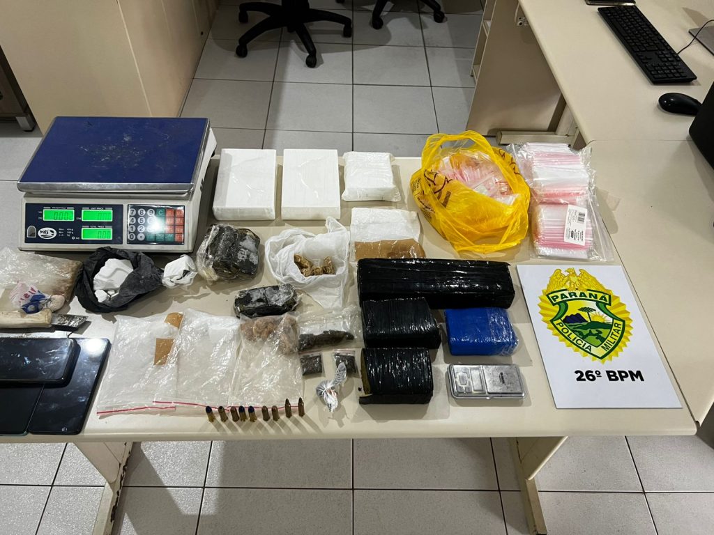 No interior da residência, foram localizadas grandes quantidades de entorpecentes, munições e diversos materiais utilizados no fracionamento, preparo e comercialização de drogas, evidenciando a estrutura utilizada para o tráfico.