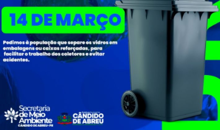 A Secretaria Municipal de Meio Ambiente de Cândido de Abreu informou que realizará, no dia 14 de março, uma ação de coleta de vidros e materiais recicláveis em diversas localidades do município de Cândido de Abreu.