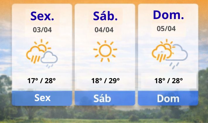 No sábado (4), o tempo começa a se estabilizar. A previsão indica predomínio de sol entre nuvens, sem expectativa de chuva, com temperaturas entre 18°C e 29°C. O clima fica mais firme, favorecendo atividades ao ar livre.