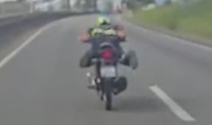 De acordo com a PRF, o condutor, de 21 anos, foi visto deitado sobre a motocicleta, simulando uma posição de voo enquanto trafegava pela rodovia. A prática é considerada ilegal e extremamente arriscada, podendo resultar em acidentes graves ou até fatais em caso de erro na execução.
