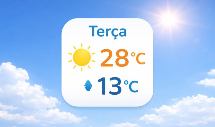 De acordo com a previsão, o dia será de sol entre nuvens, com temperaturas variando entre 13°C nas primeiras horas da manhã e podendo chegar aos 28°C durante a tarde. A condição de tempo firme predomina, sem registro de chuva e com baixa probabilidade de precipitação ao longo do dia.
