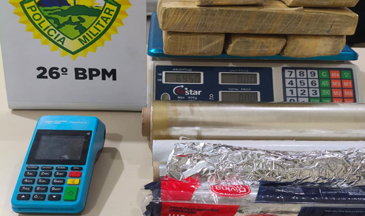 Diante dos indícios e da situação de flagrante, a equipe realizou a abordagem no imóvel. Durante as buscas, foi encontrada uma mala contendo diversos tabletes de substância análoga à maconha, além de uma balança e materiais utilizados para o fracionamento e embalagem da droga.