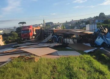 Acidente entre 2 caminhões deixa ferido e carga espalhada em rodovia de Ponta Grossa